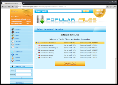 As an added twist, some results direct users that revisit the same page to a fake download site. The user is asked to download hotmail_down.rar, but not before entering their credit card information.