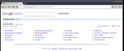 At the time of writing Google Trends shows this as one of the top searches of the day. Other dangerous searches include “hotmail down” and “hotmail not working” both of which also returned malicious URLs that can cause a visitor’s computer to become infected with malware.