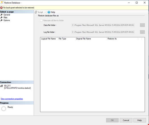 - Now, click on Files page. In the Restore database files as window, you will see the logical file names from the backup. Check the paths and change them if required. Click OK.