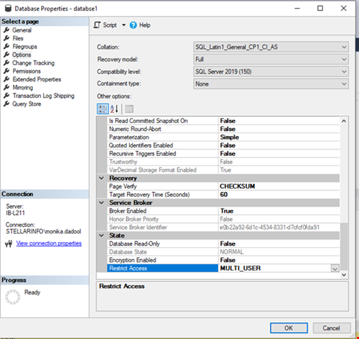 - Under Database properties, click Options, then scroll down to Restrict Access under Other options. Then, select the MULTI-USER mode. Click OK.