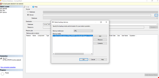 - Click on the three dots. In Select backup devices, select the backup media type, i.e., URL or backup file name. Click Add and then OK.